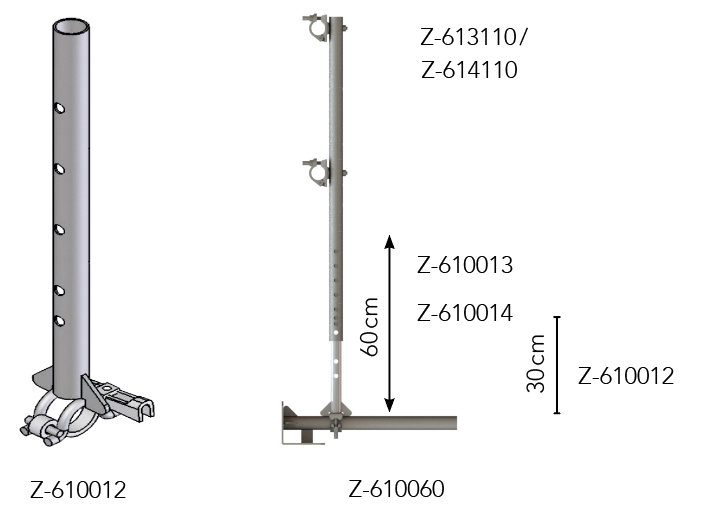 Flat roof guardrail brackets, together with coupled standards brackets, are mounted at a distance of 2 to 3.2 m, depending on the brickwork. Only scaffolding tubes with a diameter of 48.3 mm or aluminium beams may be used as guard rails.