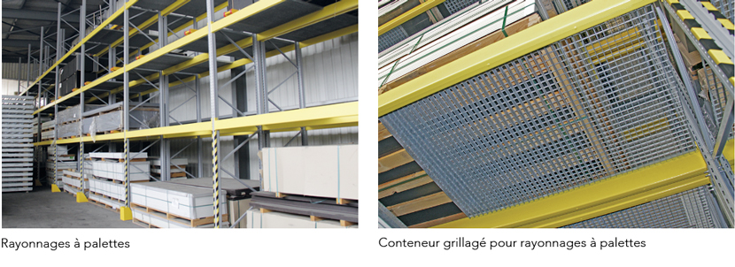Le rayonnage à palettes peut être conçu dans n’importe quelle longueur et configuré individuellement (charge jusqu’à 30’000?kg/m). Il est disponible en version galvanisée à chaud pour une utilisation à l’intérieur et à l’extérieur, ainsi qu’en version plus économique peinte ou revêtue de poudre. Notre gamme comprend de nombreux accessoires tels que des protections anti-collision et des protections anti-poussée.